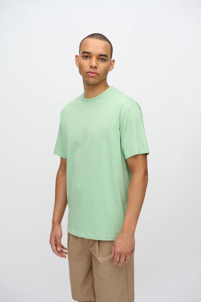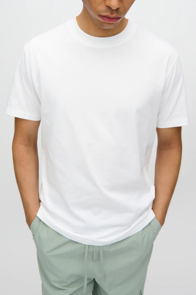 Aarhus G029 is a classy short-sleeved t-shirt crafted from 100% organic cotton for a comfortable quality. The t-shirt has a relaxed fit and features a crewneck with rib edges. The model is 188 cm tall and wears a size large.